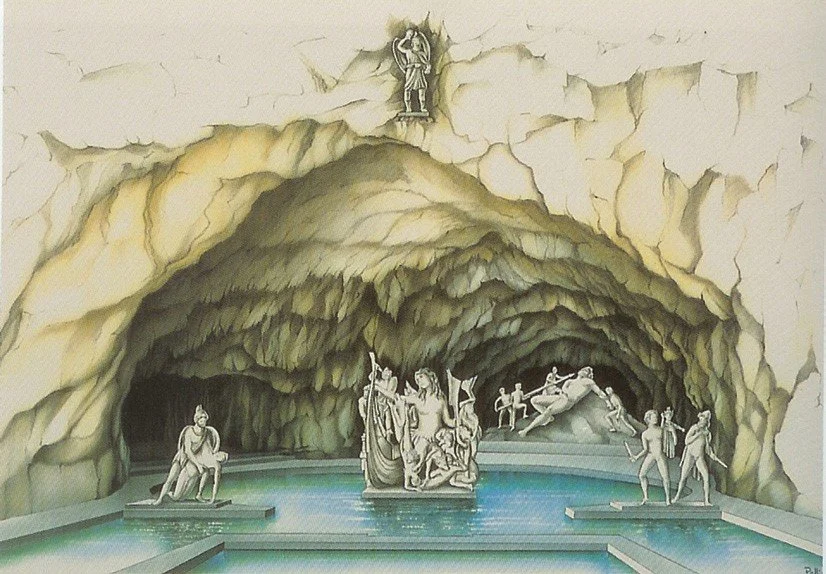 Sculpture locations: Zeus abducting Trojan Ganymedes at top, Odysseus blinding Polyphemus in the back right, Scylla destroying Odysseus’ men in the center, the so-called Pasquino group (showing either Menelaus carrying body of Patroclus or Ajax carrying Achilles) to the left, and Odysseus and Diomedes stealing the Palladion from Troy on the right. Hesione would surely have been set into the rock face above the cave as well.