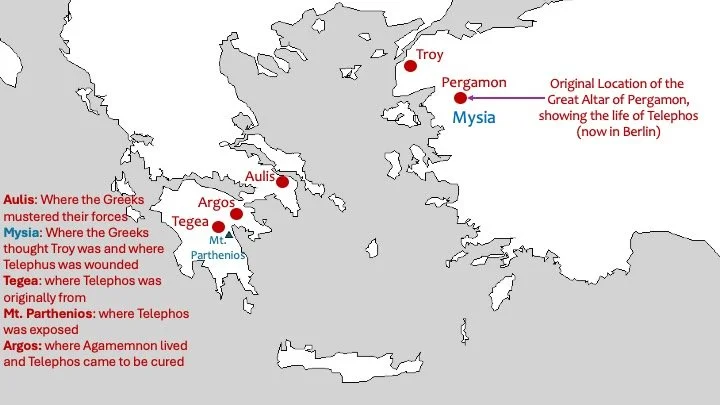 The Trojan War was the last great event of the Greek mythical storyworld. You might know, from movies and other media, that the Greeks went to war against the Trojans over the seduction of a drop-dead gorgeous woman named Helen, who famously launched a thousand ships to get her back. It was a ten—or twenty—year war that caused great suffering and losses on both sides. In this episode, the first in our series on the Trojan War, we give an overview of the war, a bit about our sources, and other conflicts in and around Troy, including Heracles’ sacking of the city and the Greeks’ attack of Mysia to the south while thinking it was Troy. To orient you, here is a map of the locations mentioned in the podcast.