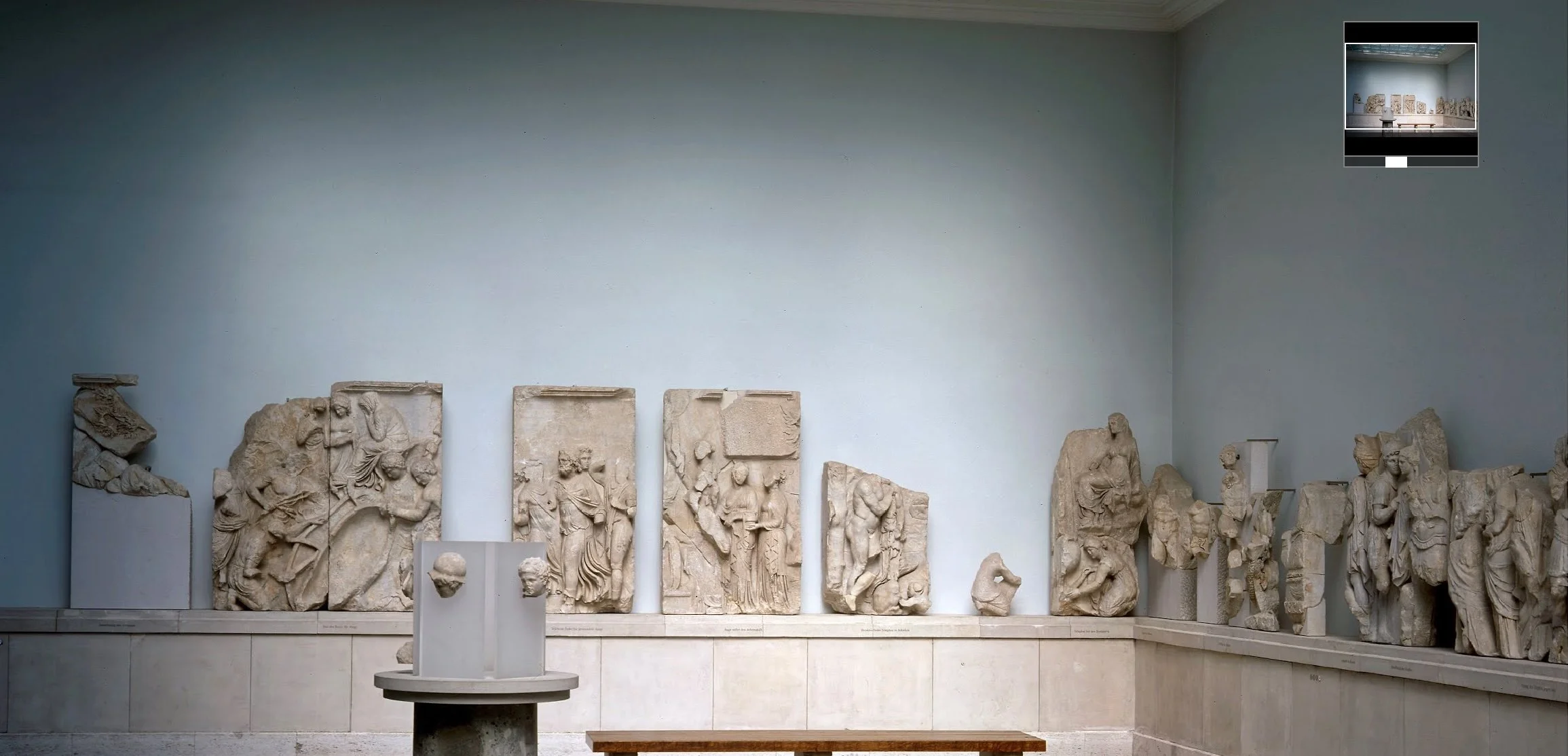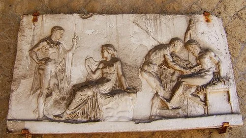 The Telephos reliefs at the Pergamonmuseum in Berlin. The central panel (above and right of the smaller display in front) shows Teuthras, the king of Mysia, finding Auge deserted on the shore.